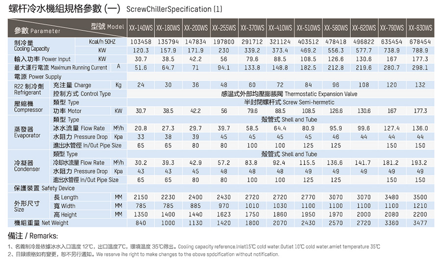 (1)機(jī)組壓縮機(jī)選用名牌半封閉螺桿式壓縮機(jī)及電控元件,配備換熱高效優(yōu)質(zhì)銅管制作的冷凝器及蒸發(fā)器;